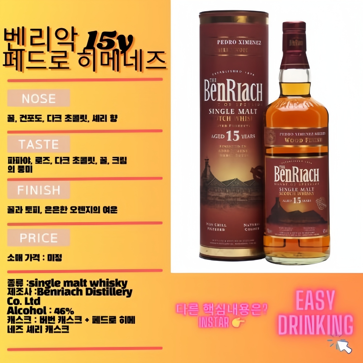 ex 셰리 캐스크에서 완전히 숙성 후 페드로 히메네즈 + 올로로소 셰리 캐스크에서 마무리한 제품으로 논 칠 필터링 제품이며 구운 사과, 카시스, 설탕, 오렌지의 아로마와 무화과, 블랙커런트, 살구, 바닐라의 맛과 풍미가 부드러우면서도 스피이시한 여운을 주는 제품이다.💖