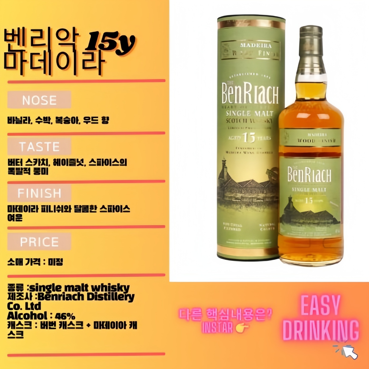 아메리칸 버번 캐스크 숙성 후 포르투갈 마데이라 캐스크 마무리 한 제품으로 바닐라, 스파이스, 수박, 복숭아와 우드 향과 함께 풍부한 마데이라 특유의 풍미가 버터 스카치, 헤이즐넛, 스파이스의 여운과 풍미를 함꼐 즐길 수 있는 제품이다.💖